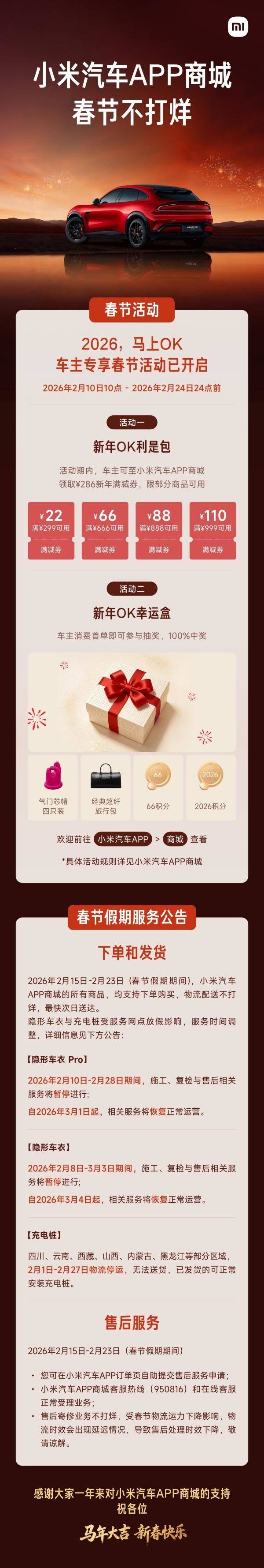 小米汽车近日宣布,春节期间小米汽车APP商城将推出一系列特别活动,同时部分服务将进行临时调整。此次活动主要面向车主群体,旨在通过多重福利提升用户节日体验,同时确保基础服务持续运营。