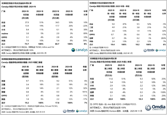 数据不会说谎。Canalys报告显示,2024年,传音控股虽仍以51%的市占率领跑非洲市场,但其出货量同比增速已大幅放缓至10%;同期,小米、realme的增速分别高达38%、89%,势头迅猛。