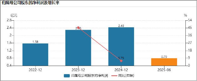 同期,公司净利润分别为1.58亿元、2.3亿元和2.43亿元,增速从2023年的45.35%降至2024年的5.79%,波动剧烈。2025年上半年,公司实现营收9.6亿元,实现净利润0.79亿元,全年营收、净利润能否实现正增长存在较大不确定性。