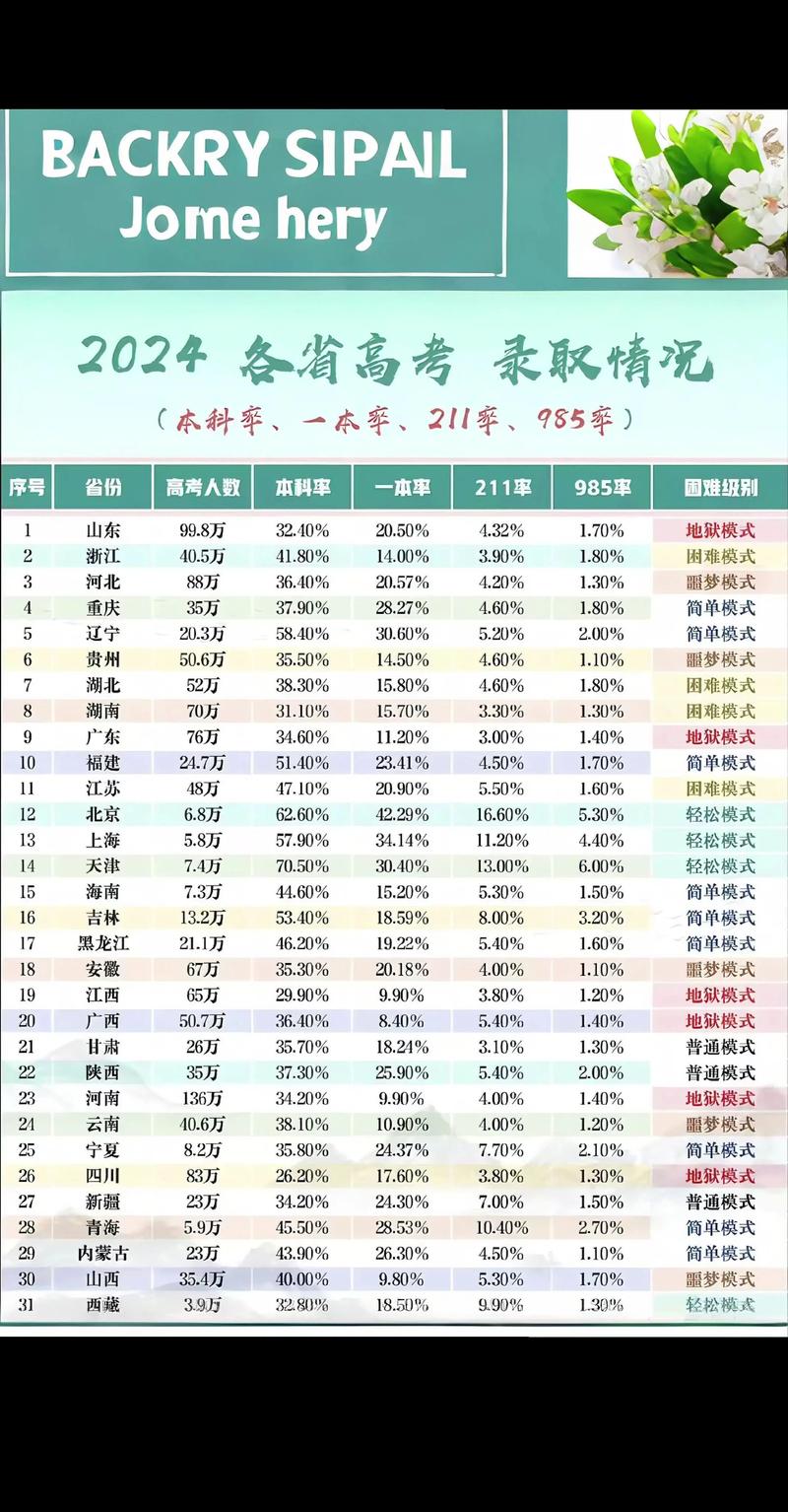 参照2024年高考给出的数据,高考总分方面展现状况最为显著突出的省份是浙江省,浙江省于高考总分这块具备着极为明显显著的优势,其一,600分以上的人数在全国范围内处于首位第一,数量达到396万之人,占据全省考生总数的16%,远远超过超出了其他省份。